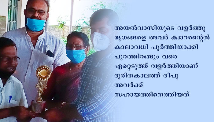 തന്റെ പശുക്കളെ വളര്ത്താന് പാട്ടത്തിനെടുത്ത് നടത്തുന്ന ഡയറി ഫാമിലേക്കാണ് ഈ മൃഗങ്ങളെ ദീപു കൊണ്ടുപോയ്ത്. ഉടമസ്ഥര് 14 ദിവസത്തെ ക്വാറന്റൈന് പൂര്ത്തിയാക്കുന്നതുവരെ അവയെ പരിചരിച്ച ദീപു അതിനുശേഷം അവരെ ഉടമയ്ക്ക് സുരക്ഷിതമായി തിരിച്ചേല്പ്പിച്ചു. കോവിഡ് കാലത്ത് ഇത്തരമൊരു മഹനീയമായ സേവന നടത്തിയ ദീപുവിനെ പള്ളം ബ്ലോക്ക് പഞ്ചായത്ത് ആദരിച്ചു.