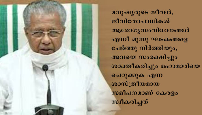 ലോകത്തെ മുഴുവനായി ഗ്രസിച്ച ഒരു മഹാമാരിയുടെ കാലത്ത് എത്ര ജീവനുകള് രക്ഷിക്കാന് സാധിച്ചു എന്നും അതിനായി എന്തൊക്കെ ചെയ്തു എന്നതുമാണ് പ്രധാനം. മനുഷ്യരുടെ ജീവന്, ജീവിതോപാധികള് ആരോഗ്യസംവിധാനങ്ങള് എന്നീ മൂന്നു ഘടകങ്ങളെ ചേര്ത്തു നിര്ത്തിയും, അവയെ സംരക്ഷിച്ചും ശാക്തീകരിച്ചും മഹാമാരിയെ ചെറുക്കുക എന്ന ശാസ്ത്രീയമായ സമീപനമാണ് കേരളം സ്വീകരിച്ചത്. അതിന്റെ ഫലമായാണ് മറ്റു മിക്ക പ്രദേശങ്ങളേക്കാള് മികച്ച രീതിയില് ജനങ്ങളുടെ ജീവന് സംരക്ഷിക്കാന് നമുക്ക് സാധിച്ചത്.