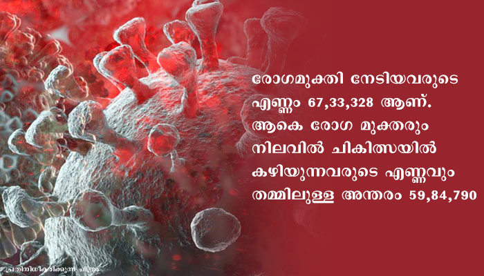 രോഗമുക്തി നേടിയവരുടെ എണ്ണം 67,33,328 ആണ്. ആകെ രോഗ മുക്തരും നിലവിൽ ചികിത്സയിൽ കഴിയുന്നവരുടെ എണ്ണവും തമ്മിലുള്ള അന്തരം 59,84,790.