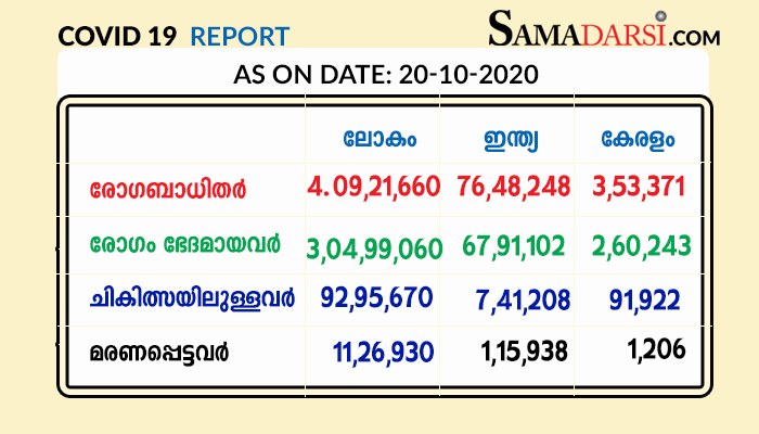 തിരുവനന്തപുരം: സംസ്ഥാനത്ത് 20.10.2020 ചൊവ്വാഴ്ച 6591 പേര്ക്ക് കോവിഡ്-19 സ്ഥിരീകരിച്ചു. തൃശൂര് 896, കോഴിക്കോട് 806, മലപ്പുറം 786, എറണാകുളം 644, ആലപ്പുഴ 592, കൊല്ലം 569, കോട്ടയം 473, തിരുവനന്തപുരം 470, പാലക്കാട് 403, കണ്ണൂര് 400, പത്തനംതിട്ട 248, കാസര്ഗോഡ് 145, വയനാട് 87, ഇടുക്കി 72 എന്നിങ്ങനേയാണ് ജില്ലകളില് ചൊവ്വാഴ്ച രോഗ ബാധ സ്ഥിരീകരിച്ചത്.