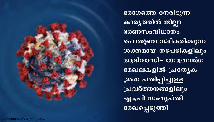 കോവിഡുമായി ബന്ധപ്പെട്ട നിലവിലെ സ്ഥിതിഗതികളും സ്വീകരിച്ചു വരുന്ന നടപടികളും ജില്ലാ കലക്ടറും ഡി.എം.ഒയും മറ്റ് ഉദ്യോഗസ്ഥരും എം.പിക്ക് വിശദീകരിച്ചു നല്കി. രോഗവ്യാപനം ഇനിയും വര്ധിക്കാന് സാധ്യതയുള്ള പശ്ചാത്തലത്തില് ദീര്ഘകാലത്തേക്കുള്ള പ്രവര്ത്തനങ്ങള് ഇനിയും വേണ്ടി വരുമെന്ന് എം.പി പറഞ്ഞു. സംസ്ഥാനത്ത് പൊതുവില് ജങ്ങളുടെ മികച്ച സഹകരണവും ഭരണ സംവിധാനത്തിന്റെയും ആരോഗ്യ പ്രവര്ത്തകര്, ആശ വര്ക്കര്മാര്, അങ്കണവാടി വര്ക്കര്മാര് തുടങ്ങിയവരുടെ സജ്ജീവ ഇടപെടലുകളും പ്രശംസനീയമാണ്. ഇക്കാര്യത്തില് തന്നെ എല്ലാ പിന്തുണയും എം.പി ഉറപ്പു നല്കി.