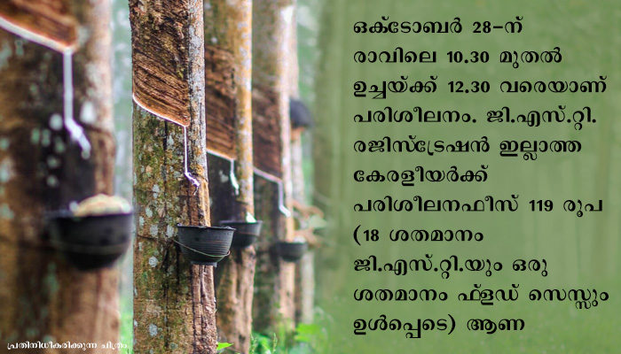 തിരുവനന്തപുരം: റബ്ബറുത്പാദനം സുസ്ഥിരമാക്കുന്നതിന് സഹായകമായ നൂതന കൃഷിരീതികളില് റബ്ബര്ബോര്ഡ് ഓണ്ലൈന് പരിശീലനം നല്കുന്നു. ഒക്ടോബര് 28-ന് രാവിലെ 10.30 മുതല് ഉച്ചയ്ക്ക് 12.30 വരെയാണ് പരിശീലനം. ജി.എസ്.റ്റി. രജിസ്ട്രേഷന് ഇല്ലാത്ത കേരളീയര്ക്ക് പരിശീലനഫീസ് 119 രൂപ (18 ശതമാനം ജി.എസ്.റ്റി.യും ഒരു ശതമാനം ഫ്ളഡ് സെസ്സും ഉള്പ്പെടെ) ആണ്. ജി.എസ്.റ്റി. രജിസ്ട്രേഷന് ഉള്ള കേരളീയര്ക്കും കേരളത്തിന് പുറത്തുള്ളവര്ക്കും 118 രൂപ ആയിരിക്കും ഫീസ്. ഡയറക്ടര് (ട്രെയിനിങ്), റബ്ബര്ബോര്ഡ് എന്ന പേരില് സെന്ട്രല് ബാങ്ക് ഓഫ് ഇന്ത്യ (ഐ.എഫ്.എസ്. കോഡ്-CBIN0284150)യുടെ കോട്ടയത്തുള്ള റബ്ബര്ബോര്ഡ് ബ്രാഞ്ചിലെ 1450300184 എന്ന അക്കൗണ്ട് നമ്പറിലേക്ക് പരിശീലനഫീസ് നേരിട്ട് അടയ്ക്കാം. ഒക്ടോബര് 27-ന് വൈകിട്ട് 5.00 മണി വരെ രജിസ്റ്റര് ചെയ്യാം. പരിശീലനം സംബന്ധിച്ച കൂടുതല് വിവരങ്ങള്ക്ക് 0481-2353127 എന്ന ഫോണ് നമ്പറിലും 7994650941 എന്ന വാട്സ്ആപ്പ് നമ്പറിലും ബന്ധപ്പെടാം.