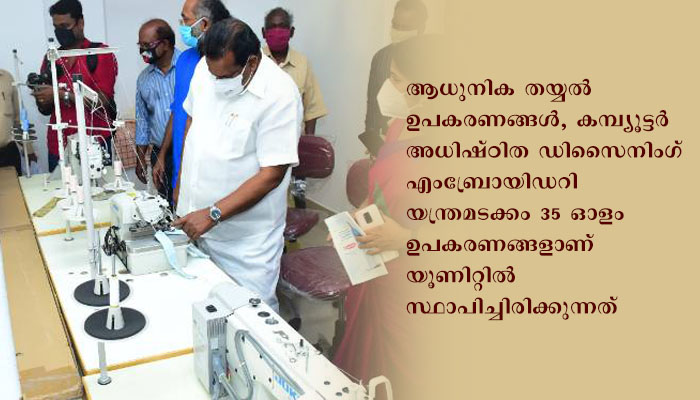 ആധുനിക തയ്യല് ഉപകരണങ്ങള്, കമ്പ്യൂട്ടര് അധിഷ്ഠിത ഡിസൈനിംഗ് എംബ്രോയിഡറി യന്ത്രമടക്കം 35 ഓളം ഉപകരണങ്ങളാണ് യൂണിറ്റില് സ്ഥാപിച്ചിരിക്കുന്നത്. ഒരു ദിവസം 500 ഷര്ട്ടുകള് ഉത്പാദിപ്പിക്കുകയാണ് ലക്ഷ്യം.ചടങ്ങില് ഹാന്റക്സ് പ്രസിഡന്റ് എന്. രതീന്ദ്രന്, കൗണ്സിലര് എസ്. പുഷ്പലത, കൈത്തറി ഡയറക്ടര് കെ.സുധീര്, വ്യവസായകേന്ദ്രം ജനറല് മാനേജര് ജി. രാജീവ്, ഹാന്റക്സ് വൈസ് പ്രസിഡന്റ് എന്. രവീന്ദ്രന് എന്നിവര് പങ്കെടുത്തു.