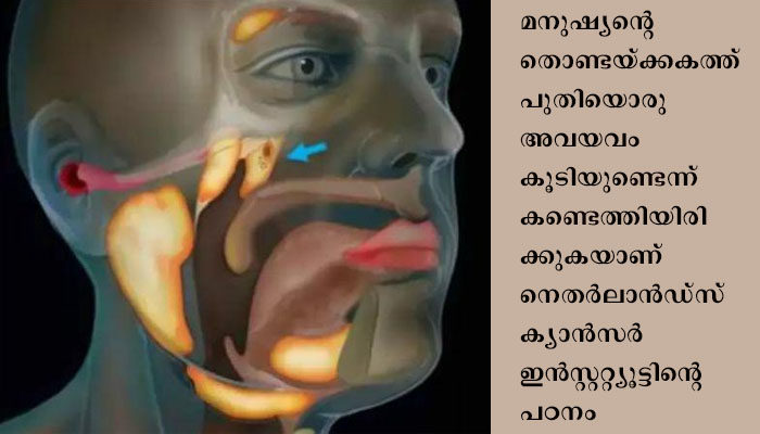 ആംസ്റ്റർഡാം: മനുഷ്യൻ്റെ തൊണ്ടയ്ക്കകത്ത് പുതിയൊരു അവയവം കൂടിയുണ്ടെന്ന് കണ്ടെത്തിയിരിക്കുകയാണ് നെതർലാൻഡ്സ് ക്യാൻസർ ഇൻസ്റ്ററ്റ്യൂട്ടിൻ്റെ പഠനം. 3.81 സെൻ്റീമീറ്റർ നീളമുള്ള ഒരു ഉമിനീർ ഗ്രന്ഥിയാണിത്. പ്രോസ്ട്രേറ്റ് ക്യാൻസർ പരിശോധനയുടെ ഭാഗമായി നടത്തിയ സി ടി ,പി ഇ ടി സ്കാനിംഗുകളിലൂടെയാണ് ഈ ഗ്രന്ഥിയെ തിരിച്ചറിഞ്ഞത്. ട്യുബേറിയൽ ഉമിനീർ ഗ്രന്ഥി (Tubarial salivary gland) എന്നാണ് ഇതിന് പേരിട്ടിരിക്കുന്നത്.