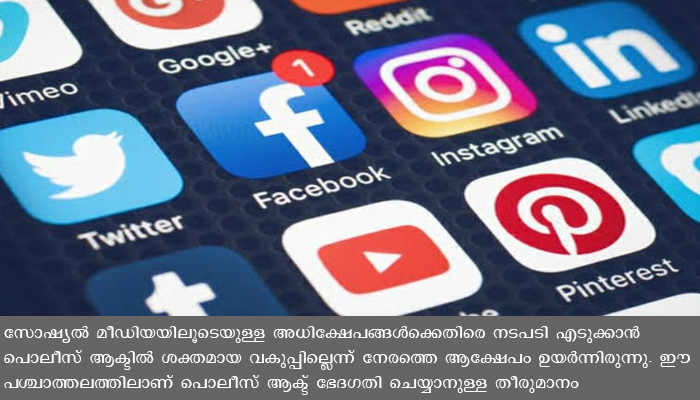 സോഷ്യല് മീഡിയയിലൂടെയുള്ള അധിക്ഷേപങ്ങള്ക്കെതിരെ നടപടി എടുക്കാന് പൊലീസ് ആക്ടില് ശക്തമായ വകുപ്പില്ലെന്ന് നേരത്തെ ആക്ഷേപം ഉയര്ന്നിരുന്നു. ഈ പശ്ചാത്തലത്തിലാണ് പൊലീസ് ആക്ട് ഭേദഗതി ചെയ്യാനുള്ള തീരുമാനം. ഇതുവരെ ജാമ്യം ലഭിക്കുന്ന വകുപ്പുകള് മാത്രമേ നിലനിന്നിരുന്നുള്ളൂ.