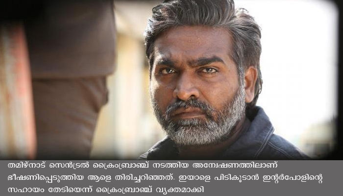 തമിഴ്നാട് സെന്ട്രല് ക്രൈംബ്രാഞ്ച് നടത്തിയ അന്വേഷണത്തിലാണ് ഭീഷണിപ്പെടുത്തിയ ആളെ തിരിച്ചറിഞ്ഞത്. ഇയാളെ പിടികൂടാന് ഇന്റര്പോളിന്റെ സഹായം തേടിയെന്ന് ക്രൈംബ്രാഞ്ച് വ്യക്തമാക്കി.