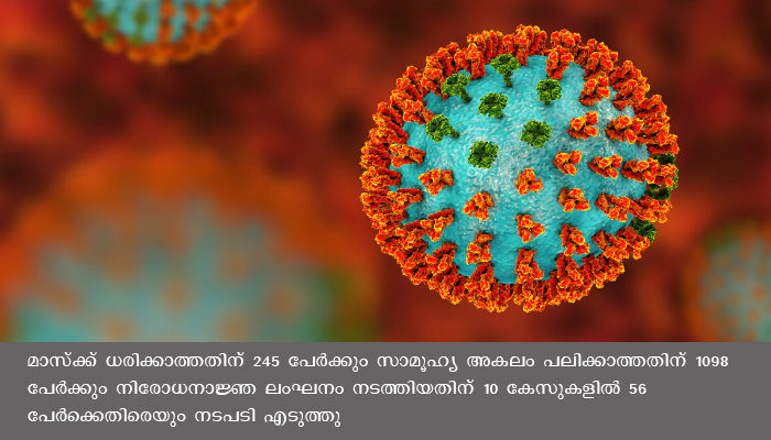 ജില്ലയിൽ കൊവിഡ് മാനദണ്ഡ ലംഘനവുമായി ബന്ധപ്പെട്ട് 44കേസുകളിൽ 44 പേരെ അറസ്റ്റ് ചെയ്തു. മാസ്ക്ക് ധരിക്കാത്തതിന് 245 പേർക്കും സാമൂഹ്യ അകലം പലിക്കാത്തതിന് 1098 പേർക്കും നിരോധനാജ്ഞ ലംഘനം നടത്തിയതിന് 10 കേസുകളിൽ 56 പേർക്കെതിരെയും നടപടി എടുത്തു.