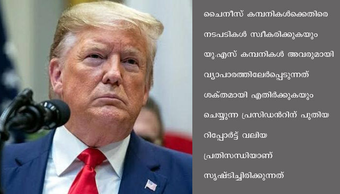 അമേരിക്കയിൽ രണ്ടാമൂഴം പ്രതീക്ഷിച്ചിരിക്കുന്ന ട്രംപ് കോവിഡ് മഹാമാരി രാജ്യത്ത് ശക്തിപ്രാപിച്ചതിന് പിന്നാലെ നിരന്തരം ചൈനക്കെതിരെ ആരോപണങ്ങളുമായി രംഗത്തെത്തിയിരുന്നു. എതിർ സ്ഥാനാർഥി ജോ ബൈഡന് ചൈനയോട് മൃദു സമീപനമാണെന്നും അദ്ദേഹം പ്രചാരണങ്ങളിൽ പറഞ്ഞിരുന്നു. ചൈനീസ് കമ്പനികൾക്കെതിരെ നടപടികൾ സ്വീകരിക്കുകയും യു.എസ് കമ്പനികൾ അവരുമായി വ്യാപാരത്തിലേർപ്പെടുന്നത് ശക്തമായി എതിർക്കുകയും ചെയ്യുന്ന പ്രസിഡൻറിന് പുതിയ റിപ്പോർട്ട് വലിയ പ്രതിസന്ധിയാണ് സൃഷ്ടിച്ചിരിക്കുന്നത്.