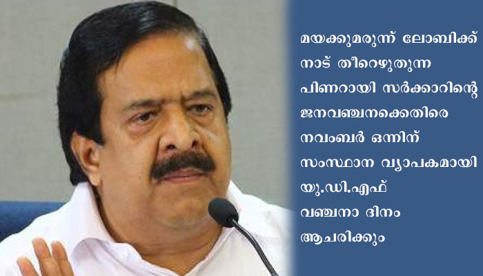 മയക്കുമരുന്ന് ലോബിക്ക് നാട് തീറെഴുതുന്ന പിണറായി സര്ക്കാറിന്റെ ജനവഞ്ചനക്കെതിരെ നവംബര് ഒന്നിന് സംസ്ഥാന വ്യാപകമായി യു.ഡി.എഫ് വഞ്ചനാ ദിനം ആചരിക്കും. മയക്കുമരുന്ന് ഉപഭോഗവും വില്പനയും സംസ്ഥാനത്തിന്റെ ചരിത്രത്തില് കേട്ടുകേള്വി പോലും ഇല്ലാത്ത തരത്തില് വളർന്നിരിക്കുകയാണെന്ന് രമേശ് ചെന്നിത്തല പറഞ്ഞു.