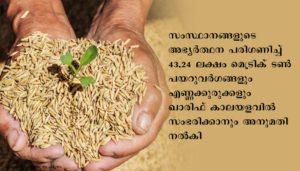 തിരുവനന്തപുരം: കർഷകരിൽ നിന്ന് താങ്ങുവില നിരക്കിൽ ഖാരിഫ് ഉത്പന്നങ്ങൾ 2020-21, വാങ്ങുന്നത് കേന്ദ്ര സർക്കാർ നടപ്പ് സീസണിലും തുടർന്നു. മുൻ വർഷങ്ങളെ പോലെ തന്നെ നിലവിലെ താങ്ങുവില നിരക്കിൽ തന്നെ ആണ് ഉത്പന്നങ്ങൾ സംഭരിച്ചത്.