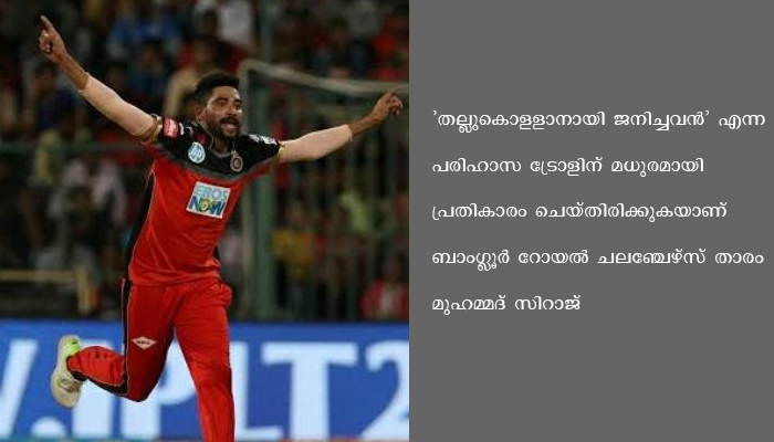 ദുബൈ: ‘തല്ലുകൊളളാനായി ജനിച്ചവൻ’ എന്ന പരിഹാസ ട്രോളിന് മധുരമായി പ്രതികാരം ചെയ്തിരിക്കുകയാണ് ബാംഗ്ലൂർ റോയൽ ചലഞ്ചേഴ്സ് താരം മുഹമ്മദ് സിറാജ്.
