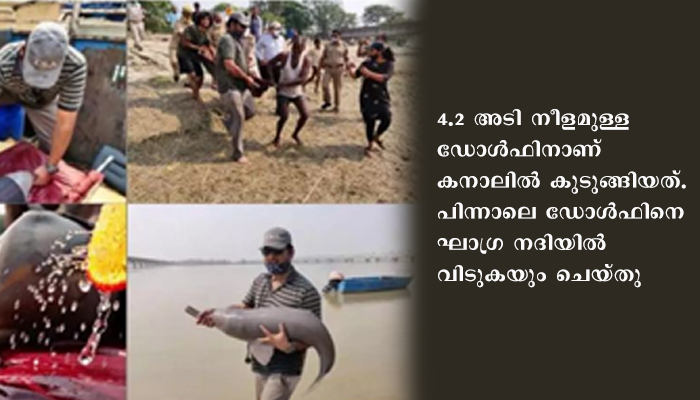 സംഭവത്തിന്റെ ദൃശ്യങ്ങള് സോഷ്യല് മിഡീയയില് വൈറലായിട്ടുണ്ട്. 4.2 അടി നീളമുള്ള ഡോള്ഫിനാണ് കനാലില് കുടുങ്ങിയത്. പിന്നാലെ ഡോള്ഫിനെ ഘാഗ്ര നദിയില് വിടുകയും ചെയ്തു.