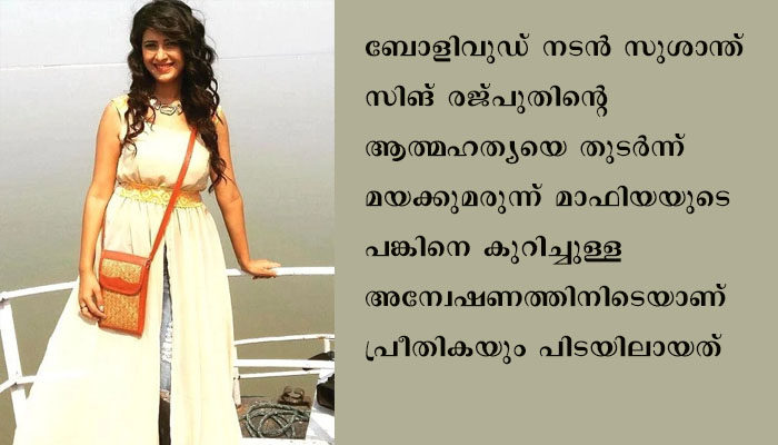 ആത്മഹത്യയെ തുടർന്ന് മയക്കുമരുന്ന് മാഫിയയുടെ പങ്കിനെ കുറിച്ചുള്ള അന്വേഷണത്തിനിടെയാണ് പ്രീതികയും പിടയിലായത്. സുശാന്തിൻ്റെ കാമുകി റിയ ചക്രവര്ത്തിയുടെ വാട്സ് ആപ് ചാറ്റുകള് പുറത്തായതോടെയാണ് സുശാന്തിൻ്റെ മരണത്തില് മയക്കുമരുന്ന് മാഫിയയുടെ പങ്ക് അന്വേഷിച്ചത്.