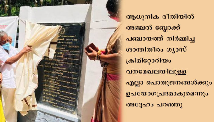വികസനം എന്ന് പറയുമ്പോള് സാധാരണയായി റോഡ്, പാലം, കെട്ടിടം എന്നിവയണ് ജനങ്ങളുടെ മനസ്സിലേക്കെത്തുന്നത്. എന്നാല് ഒരു സമൂഹത്തിന് ഏറ്റവും അത്യാവശ്യമായ ഒന്നാണ് പൊതുശ്മശാനം. കോവിഡ് പോലുള്ള പ്രതിസന്ധി നിലനില്ക്കുമ്പോള് ആധുനിക ശവസംസ്കാര രീതികള് അവലംബിക്കേണ്ടതും അനിവാര്യമാണ്. മരണപ്പെട്ടവരെ അടക്കം ചെയ്യുന്നതിന് ആറടി മണ്ണില്ലാത്തവര്ക്കും പൊതുശ്മശാനം പ്രയോജനപ്പെടും. പരമ്പരാഗത രീതിയിലുള്ള ശവസംസ്കാര ചടങ്ങുകള് മണ്ണും വായുവും ജലവും എല്ലാം മലിനീകരിക്കുന്നു. ആധുനിക രീതിയില് അഞ്ചല് ബ്ലോക്ക് പഞ്ചായത്ത് നിര്മ്മിച്ച ശാന്തിതീരം ഗ്യാസ് ക്രിമിറ്റോറിയം വനമേഖലയിലുള്ള എല്ലാ പൊതുജനങ്ങള്ക്കും ഉപയോഗപ്രദമാകുമെന്നും അദ്ദേഹം പറഞ്ഞു.
