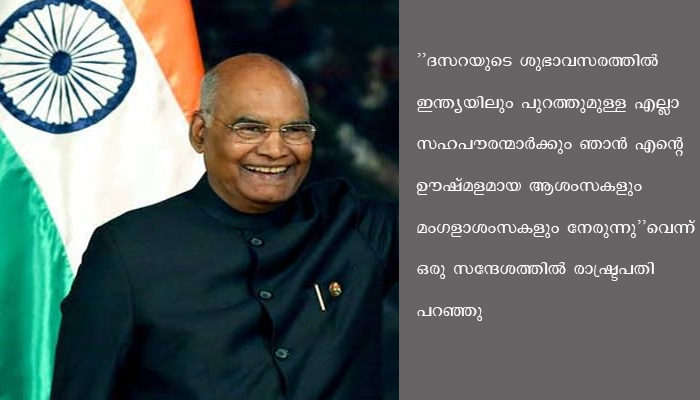 ”ദസറയുടെ ശുഭാവസരത്തില് ഇന്ത്യയിലും പുറത്തുമുള്ള എല്ലാ സഹപൗരന്മാര്ക്കും ഞാന് എന്റെ ഊഷ്മളമായ ആശംസകളും മംഗളാശംസകളും നേരുന്നു”വെന്ന് ഒരു സന്ദേശത്തില് രാഷ്ട്രപതി പറഞ്ഞു.