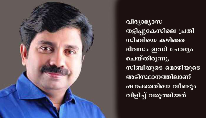 കോഴിക്കോട് യൂണിറ്റ് ഓഫീസിൽ 26/10/20 തിങ്കളാഴ്ച രാവിലെയാണ് ചോദ്യം ചെയ്യൽ ആരംഭിച്ചത്. വിദ്യാഭ്യാസ തട്ടിപ്പുകേസിലെ പ്രതി സിബിയെ കഴിഞ്ഞ ദിവസം ഇഡി ചോദ്യം ചെയ്തിരുന്നു. സിബിയുടെ മൊഴിയുടെ അടിസ്ഥാനത്തിലാണ് ഷൗക്കത്തിനെ വീണ്ടും വിളിച്ച് വരുത്തിയത്.