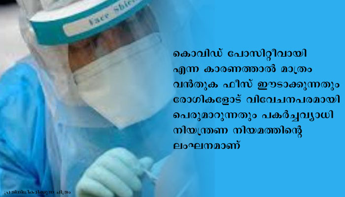 അതേസമയം, കൊവിഡ് പോസിറ്റീവായി എന്ന കാരണത്താല്‍ മാത്രം വന്‍തുക ഫീസ് ഈടാക്കുന്നതും രോഗികളോട് വിവേചനപരമായി പെരുമാറുന്നതും പകര്‍ച്ചവ്യാധി നിയന്ത്രണ നിയമത്തിന്റെ ലംഘനമാണ്. ഇത്തരം സ്ഥാപനങ്ങള്‍ക്കെതിരേ ആക്ടിന്റെ വിവിധ വകുപ്പുകള്‍ പ്രകാരം നടപടി സ്വീകരിക്കുമെന്നും ജില്ലാ കലക്ടര്‍ മുന്നറിയിപ്പ് നല്‍കി.