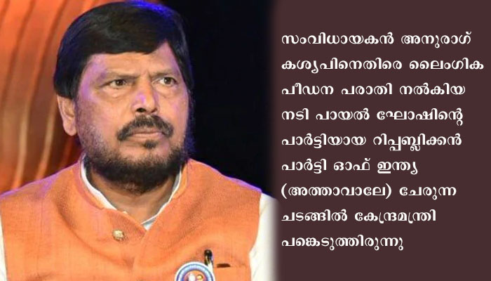 സംവിധായകന് അനുരാഗ് കശ്യപിനെതിരെ ലൈംഗിക പീഡന പരാതി നല്കിയ നടി പായല് ഘോഷിന്റെ പാര്ട്ടിയായ റിപ്പബ്ലിക്കന് പാര്ട്ടി ഓഫ് ഇന്ത്യ(അത്താവാലേ) ചേരുന്ന ചടങ്ങില് കേന്ദ്രമന്ത്രി പങ്കെടുത്തിരുന്നു. നിരവധി പേരാണ് പരിപാടിക്ക് എത്തിയത്. കഴിഞ്ഞ ദിവസം മഹാരാഷ്ട്ര ഉപമുഖ്യമന്ത്രി അജിത് പവാറിനും കൊവിഡ് സ്ഥിരീകരിച്ചിരുന്നു.