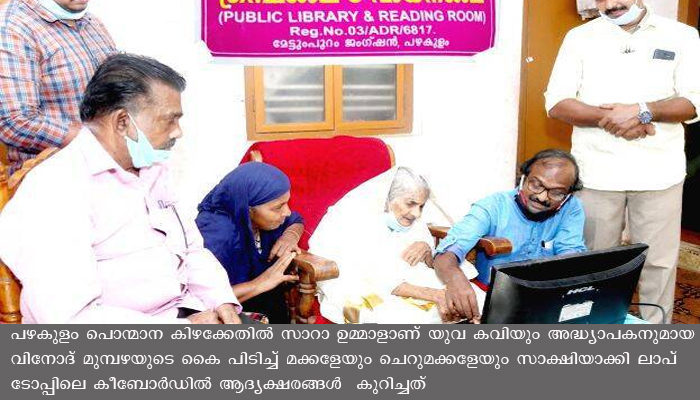 പഴകുളം പൊന്മാന കിഴക്കേതില്‍ സാറാ ഉമ്മാളാണ് യുവ കവിയും അദ്ധ്യാപകനുമായ വിനോദ് മുമ്പഴയുടെ കൈ പിടിച്ച് മക്കളേയും ചെറുമക്കളേയും സാക്ഷിയാക്കി ലാപ് ടോപ്പിലെ കീബോര്‍ഡില്‍ ആദ്യക്ഷരങ്ങള്‍ കുറിച്ചത്. പഴകുളം സ്വരാജ് ഗ്രന്ഥശാലയണ് ഈ രണ്ട് ചടങ്ങുകള്‍ക്കും വേദിയായത്.
