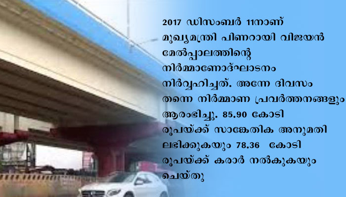 2017 ഡിസംബര് 11നാണ് മുഖ്യമന്ത്രി പിണറായി വിജയന് മേല്പ്പാലത്തിന്റെ നിര്മ്മാണോദ്ഘാടനം നിര്വ്വഹിച്ചത്. അന്നേ ദിവസം തന്നെ നിര്മ്മാണ പ്രവര്ത്തനങ്ങളും ആരംഭിച്ചു. 85.90 കോടി രൂപയ്ക്ക് സാങ്കേതിക അനുമതി ലഭിക്കുകയും 78.36 കോടി രൂപയ്ക്ക് കരാര് നല്കുകയും ചെയ്തു.