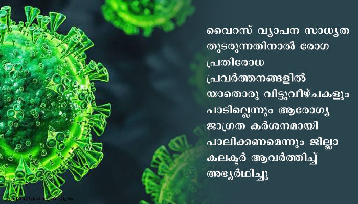 പൊതുജനാരോഗ്യം മുന്നിര്ത്തി ജില്ലയില് പ്രഖ്യാപിച്ച നിയന്ത്രണങ്ങള് പാലിക്കാന് എല്ലാവരും ശ്രദ്ധിക്കണമെന്നും ഇക്കാര്യത്തില് വീഴ്ച പാടില്ലെന്നും ജില്ലാ മെഡിക്കല് ഓഫീസര് ആവര്ത്തിച്ച് അറിയിച്ചു. വീടുകളില് നിരീക്ഷണത്തിലുള്ളവര് യാതൊരു കാരണവശാലും മറ്റുള്ളവരുമായി സമ്പര്ക്കത്തിലേര്പ്പെടാതെ റൂം ക്വാറന്റീന് നിര്ദേശങ്ങള് പൂര്ണ്ണമായും പാലിക്കണം. മുതിര്ന്ന പൗരന്മാര്, കുട്ടികള്, ഗര്ഭിണികള്, മാറാരോഗികള് എന്നിവര് വൈറസ് ബാധിതരാകുമ്പോള് ആരോഗ്യസ്ഥിതി ഗുരുതരമാകാനുള്ള സാധ്യത കൂടുതലാണ്. ഇത് തിരിച്ചറിഞ്ഞുള്ള ഇടപെടലാണ് പൊതുസമൂഹത്തില് നിന്ന് ഉണ്ടാകേണ്ടത്.
