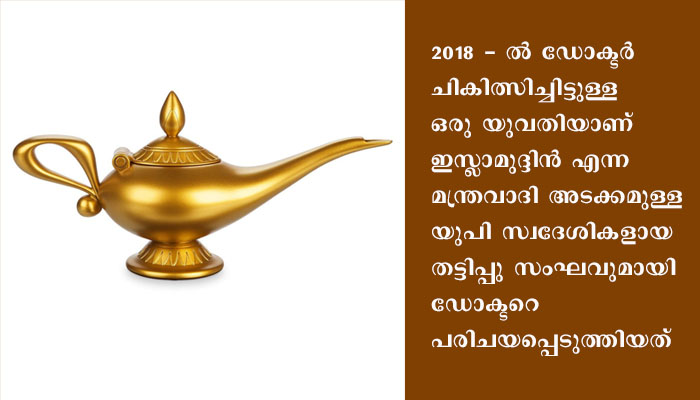 ഇവർ ഡോക്ടറോട് തങ്ങളുടെ കയ്യില് അത്ഭുത സിദ്ധികളുള്ള അലാവുദ്ദീന്റെ വിളക്കുണ്ട് എന്ന് പറഞ്ഞു വിശ്വസിപ്പിച്ചു. അത്ഭുതവിളക്കിന്റെ മുകളില് മൂന്നുവട്ടം ഉഴിഞ്ഞാല് അതിനുള്ളില് നിന്നും ഒരു ജിന്ന് പുറത്തുവരുമെന്നും എന്താഗ്രഹം പ്രകടിപ്പിച്ചാലും ജിന്ന് അപ്പോള് തന്നെ സാധിച്ചു തരുമെന്നും വിശ്വസിപ്പിച്ചു.