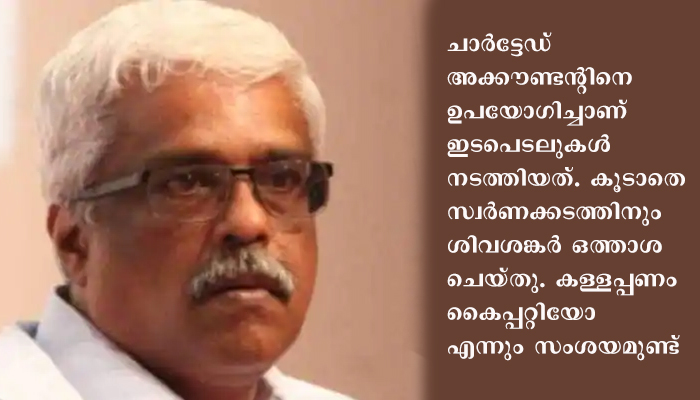 കൊച്ചി: സ്വര്ണക്കടത്ത് കേസില് നയതന്ത്ര ബാഗേജ് വിട്ടുകിട്ടാന് തന്റെ ഇടപെടൽ ഉണ്ടായിരുന്നതായി മുഖ്യമന്ത്രിയുടെ മുൻ പ്രിൻസിപ്പൽ സെക്രട്ടറി എം. ശിവശങ്കർ സമ്മതിച്ചുവെന്ന് എന്ഫോഴ്സ്മെന്റ് ഡയറക്ടറേറ്റ് (ഇഡി). സ്വപ്നയുടെ സാമ്പത്തിക ഇടപാടുകളും നിയന്ത്രിച്ചു. ചാര്ട്ടേഡ് അക്കൗണ്ടന്റിനെ ഉപയോഗിച്ചാണ് ഇടപെടലുകൾ നടത്തിയത്. കൂടാതെ സ്വർണക്കടത്തിനും ശിവശങ്കര് ഒത്താശ ചെയ്തു. കള്ളപ്പണം കൈപ്പറ്റിയോ എന്നും സംശയമുണ്ട്. ബിനാമി ഇടപാടുകൾ നടത്തിയതായും കുറ്റം ചുമത്തിയിട്ടുണ്ട്.