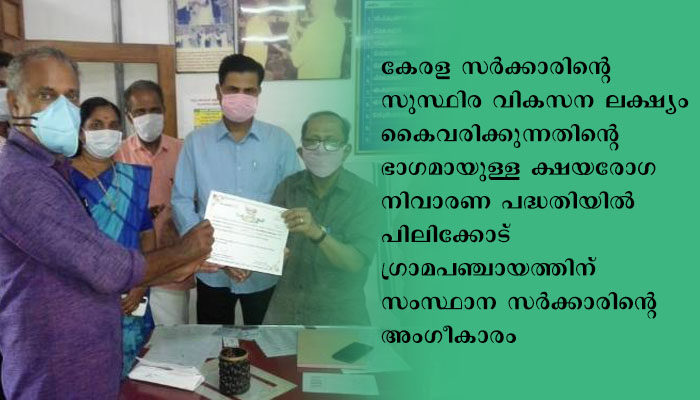 ക്ഷയരോഗം നിര്മ്മാര്ജ്ജന പദ്ധതിയുടെ ആദ്യപടിയായി കാണുന്ന 2020 ഓടുകൂടി ക്ഷയ രോഗ മരണം പൂര്ണ്ണമായും ഇല്ലാതാക്കുക എന്ന ലക്ഷ്യത്തോടെ ക്ഷയരോഗ ബാധയുള്ളവരെ കണ്ടെത്തുവാനുള്ള പുതിയ കഫപരിശോധന രീതിക്കായി വളണ്ടിയര്മാരെ പിലിക്കോട് ഗ്രാമപഞ്ചായത്തില് സജ്ജമാക്കിയിട്ടുണ്ട്. ഇത്തരത്തിലുള്ള സിബിനാറ്റ് പരിശോധനാരീതി ഏറ്റവും ശാസ്{തീയമാണ് എന്നതാണ് ഇതിന്റെ പ്രത്യേകത. ഈ നേട്ടം കൈവരിക്കുന്നതിന് പിന്നില് പ്രവര്ത്തിച്ച ആരോഗ്യപ്രവര്ത്തകരെയും മറ്റും പഞ്ചായത്ത് പ്രസിഡന്റ് ടി.വി ശ്രീധരന് മാസ്റ്റര് അഭിനന്ദിച്ചു . ആരോഗ്യ വകുപ്പ്മന്ത്രി കെ.കെ. ശൈലജ ടീച്ചര് സാക്ഷ്യപ്പെടുത്തിയ പ്രശംസാപത്രം ജില്ലാ ട്രീറ്റ്മെന്റ് സൂപ്പര്വൈസര് സി. സുകുമാരന് പഞ്ചായത്ത് പ്രസിഡന്റ് ടി.വി.ശ്രീധരന് മാസ്റ്റര്ക്ക് കൈമാറി.വൈസ് പ്രസിഡന്റ് ടി.വി. ശൈലജ, ആരോഗ്യ വിദ്യഭ്യാസ സ്റ്റാന്റിംഗ് കമ്മിറ്റി ചെയര്മാന് കെ.ദാമോദരന്, വാര്ഡ് മെമ്പര് ഓമന.ടി, സെക്രട്ടറി രമേശന് .കെ ജെ.എച്ച് ഐമാരായ സി.വി.സുരേശന്, വിനോദ് ടി. എന്നിവര് പങ്കെടുത്തു.