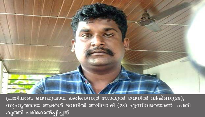 പ്രതിയുടെ ബന്ധുവായ കരിങ്ങന്നൂര് ഗോകുല് ഭവനില് വിഷ്ണു(29), സുഹൃത്തായ ആദര്ശ് ഭവനില് അഭിലാഷ് (28) എന്നിവരെയാണ് പ്രതി കുത്തി പരിക്കേല്പ്പിച്ചത്. കഴിഞ്ഞ ദീവസം രാത്രി ഏഴരയോടെയാണ് സംഭവം. ബന്ധുവായ വിഷ്ണുവിനോടുളള മുന് വൈരാഗ്യമാണ് അക്രമത്തിന് കാരണമെന്ന് പോലീസ് പറഞ്ഞു