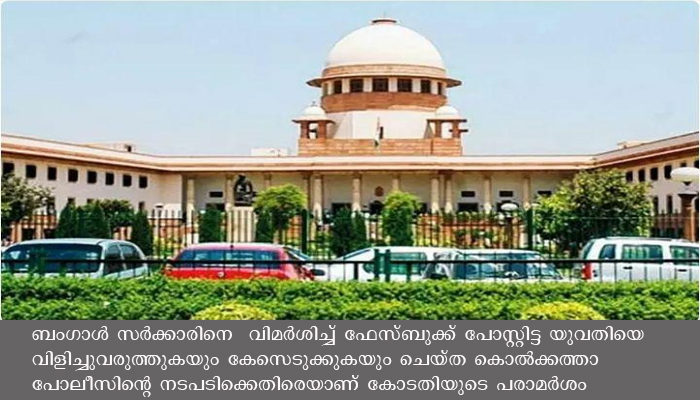 ന്യൂഡൽഹി: സർക്കാരിനെ വിമർശിച്ചതിന് സാധാരണ പൗരന്മാരെ ഉപദ്രവിക്കുന്നത് ശരിയല്ലെന്ന് സുപ്രീം കോടതി. ബംഗാൾ സർക്കാരിനെ വിമർശിച്ച് ഫേസ്ബുക്ക് പോസ്റ്റിട്ട യുവതിയെ വിളിച്ചുവരുത്തുകയും കേസെടുക്കുകയും ചെയ്ത കൊൽക്കത്താ പോലീസിൻ്റെ നടപടിക്കെതിരെയാണ് കോടതിയുടെ പരാമർശം.