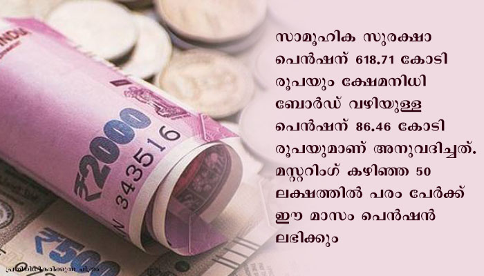 തിരുവനന്തപുരം: സാമൂഹിക സുരക്ഷാ / ക്ഷേമ നിധി ബോര്‍ഡ് വഴിയുള്ള പെന്‍ഷന്‍ വിതരണം കഴിഞ്ഞദിവസം ആരംഭിച്ചതായി മുഖ്യമന്ത്രി പിണറായി വിജയന്‍ പറഞ്ഞു. സാമൂഹിക സുരക്ഷാ പെന്‍ഷന് 618.71 കോടി രൂപയും ക്ഷേമനിധി ബോര്‍ഡ് വഴിയുള്ള പെന്‍ഷന് 86.46 കോടി രൂപയുമാണ് അനുവദിച്ചത്. മസ്റ്ററിംഗ് കഴിഞ്ഞ 50 ലക്ഷത്തില്‍ പരം പേര്‍ക്ക് ഈ മാസം പെന്‍ഷന്‍ ലഭിക്കും. അതാത് മാസത്തെ പെന്‍ഷന്‍ അതാത് മാസം തന്നെ വിതരണം ചെയ്യുമെന്ന പ്രകടന പത്രികയിലെ വാഗ്ദാനമാണ് സര്‍ക്കാര്‍ ഈ സാമ്പത്തിക ബുദ്ധിമുട്ടുകള്‍ക്കിടയിലും നടപ്പിലാക്കിയതെന്ന് മുഖ്യമന്ത്രി പറഞ്ഞു.