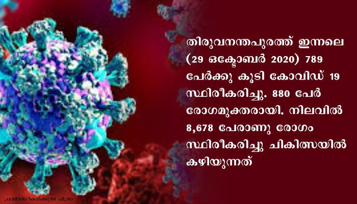 തിരുവനന്തപുരം : തിരുവനന്തപുരത്ത് ഇന്നലെ (29 ഒക്ടോബര്‍ 2020) 789 പേര്‍ക്കു കൂടി കോവിഡ് 19 സ്ഥിരീകരിച്ചു. 880 പേര്‍ രോഗമുക്തരായി. നിലവില്‍ 8,678 പേരാണു രോഗം സ്ഥിരീകരിച്ചു ചികിത്സയില്‍ കഴിയുന്നത്.