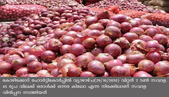കോഴിക്കോട്: കോഴിക്കോട് ഹോര്ട്ടികോര്പ്പില് വ്യാഴാഴ്ച(29/10/2020) വിറ്റത് 2 ടണ് സവാള . 45 രൂപ വിലക്ക് ഒരാള്ക്ക് ഒന്നര കിലോ എന്ന നിരക്കിലാണ് സവാള വില്പ്പന നടത്തിയത്.