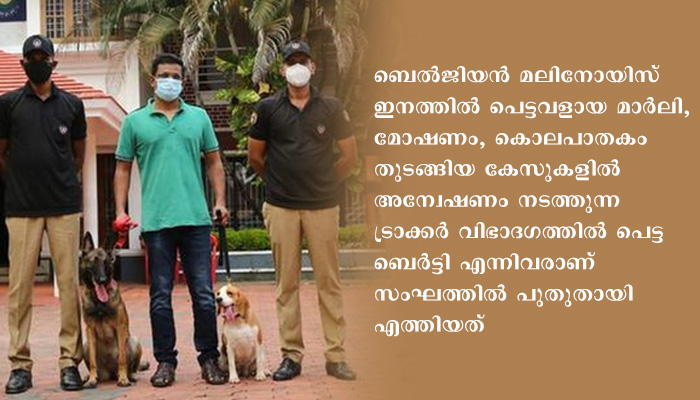 ആലുവ: ജില്ലാ റൂറല്‍ പോലീസ്‌ ഡോഗ്‌ സ്‌ക്വാഡിലേക്ക്‌ രണ്ടുപേര്‍ കൂടി എത്തി. ബെല്‍ജിയന്‍ മലിനോയിസ്‌ ഇനത്തില്‍ പെട്ടവളായ മാര്‍ലി, മോഷണം, കൊലപാതകം തുടങ്ങിയ കേസുകളില്‍ അന്വേഷണം നടത്തുന്ന ട്രാക്കര്‍ വിഭാദഗത്തില്‍ പെട്ട ബെര്‍ട്ടി എന്നിവരാണ്‌ സംഘത്തില്‍ പുതുതായി എത്തിയത്‌. പോലീസ്‌ അക്കാദമിയിലെ ഒമ്പത്‌ മാസത്തെ പരിശീലനം കഴിഞ്ഞാണ്‌ ഇവരെത്തുന്നതെന്ന്‌ ജില്ലാ പോലീസ്‌ മേധാവി കെ കാര്‍ത്തിക്‌ പറഞ്ഞു. സ്‌പോടക വസ്‌തുക്കള്‍ കണ്ടെത്തുന്നതിലാണ്‌ ബെര്‍ട്ടിയുടെ മികവ്‌. എയര്‍പോര്‍ട്ടുകളിലും മറ്റും ജോലി ചെയ്യുന്നതില്‍ മിടുക്കിയാണ്‌ ബെര്‍ട്ടി. പഞ്ചാബ്‌ ഹോം ഗാര്‍ഡ്‌ ഡിപ്പാര്‍ട്ടുമെന്റില്‍ നിന്നാണ്‌ ഇവരെ വാങ്ങിയത്‌.
