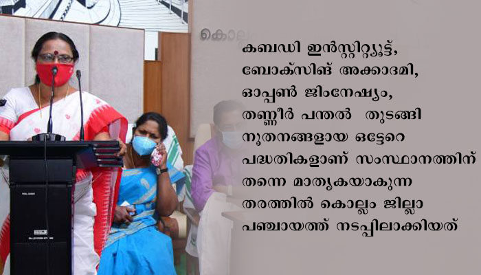 ആരോഗ്യമേഖലയിലെ മികവുറ്റ പ്രവര്ത്തനത്തിന്റെ തെളിവാണ് ജില്ലാ ആശുപത്രിയിലെ സമാനതകളില്ലാത്ത വികസന പ്രവര്ത്തനങ്ങളെന്നും ജില്ലാ പഞ്ചായത്ത് പ്രസിഡന്റ് പറഞ്ഞു. സുഭിക്ഷ കേരളം പദ്ധതിയുടെ ഭാഗമായി കാര്ഷികമേഖലയില് മികവുറ്റ പ്രവര്ത്തനങ്ങളാണ് നടത്തിയിരിക്കുന്നത്. ജയന് സ്മാരക ഹാള്, തദ്ദേശ ഭാഷാ പഠനകേന്ദ്രം എന്നിവയെല്ലാം അഭിമാനിക്കാവുന്ന നേട്ടങ്ങളാണ്. ഭിന്നശേഷിക്കാരുടെ സംരക്ഷണം ഉറപ്പാക്കാന് ഒട്ടേറെ പദ്ധതികളാണ് നടപ്പിലാക്കിയത്. വ്യവസായ സംരംഭങ്ങള് പ്രോത്സാഹിപ്പിക്കുന്നതിനായി പത്തനാപുരത്തും കരീപ്രയിലും വ്യവസായ എസ്റ്റേറ്റ് സ്ഥാപിച്ചു. വികസനത്തിനൊപ്പം ജന ക്ഷേമത്തിനും തുല്യപരിഗണന നല്കിയ പ്രവര്ത്തനമാണ് ഭരണസമിതിയുടെ കാലയളവില് നടപ്പാക്കിയതെന്ന് പ്രസിഡന്റ് കൂട്ടിച്ചേര്ത്തു.