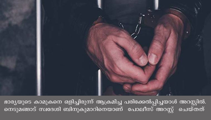 ബിനുവിന്റെ സുഹൃത്തുകൂടിയായ കാമുകന് കഴിഞ്ഞ ദിവസം രാത്രി ഭാര്യയെ കാണാനെത്തിയപ്പോഴാണ് ഒളിഞ്ഞിരുന്ന ബിനു കമ്പിപ്പാരകൊണ്ട് തലക്കടിച്ച് പരിക്കേല്പ്പിച്ചത്. അതിനുശേഷം ഓടി രക്ഷപെട്ട ബിനുവിനെ ആനാട് നിന്നും നെടുമങ്ങാട് പോലീസ് അറസറ്റ് ചെയ്തു. കോലപാതക ശ്രമത്തിന് കേസെടുത്ത് കോടതിയ്ല് ഹാജരാക്കിയ ബിനുവിനെ റിമാന്റ് ചെയ്തു.