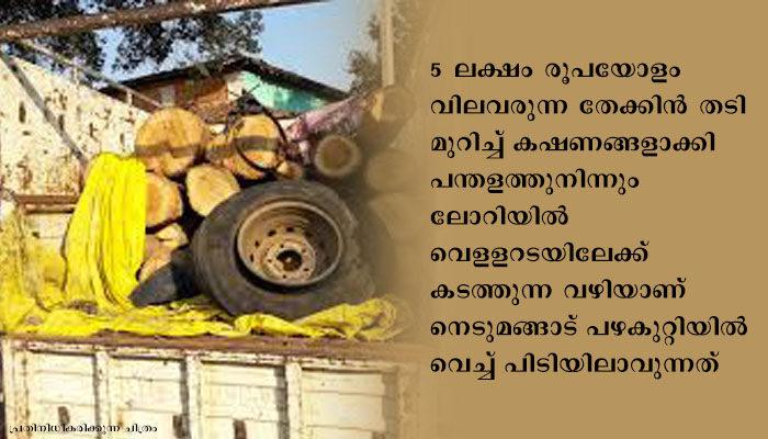 5 ലക്ഷം രൂപയോളം വിലവരുന്ന തേക്കിന്‍ തടി മുറിച്ച്‌ കഷണങ്ങളാക്കി പന്തളത്തുനിന്നും ലോറിയില്‍ വെളളറടയിലേക്ക്‌ കൊണ്ടുവരുന്ന വഴിയാണ്‌ നെടുമങ്ങാട്‌ പഴകുറ്റിയില്‍ വെച്ച്‌ പിടിയിലാവുന്നത്‌.