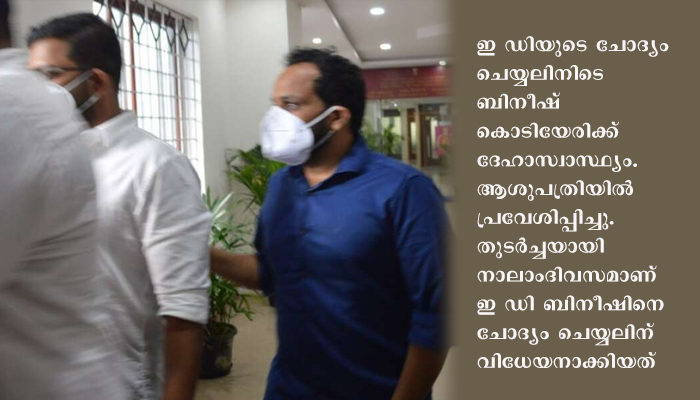 ലഹരിമരുന്ന് കേസുമായി ബന്ധപ്പെട്ട പണമിടപാടില് ബിനീഷ് കൊടിയേരിയെ എന്ഫോഴ്സ്മെന്റ് ഡയറക്ടറേറ്റ് അറസ്റ്റുചെയ്തിരുന്നു. തുടർന്ന് 1-11-2020 ഞായറാഴ്ച ചോദ്യം ചെയ്യുന്നതിനിടെയാണ് ദേഹാസ്വാസ്ഥ്യം അനുഭവപ്പെട്ടത്.