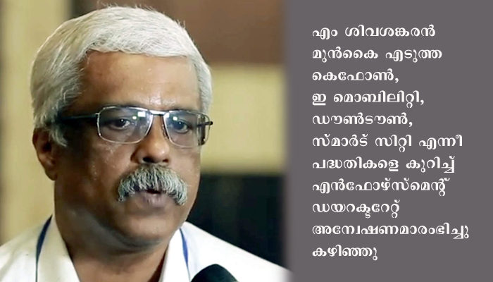 തിരുവനന്തപുരം: സ്വർണക്കടത്തിലെ അന്വേഷണം സംസ്ഥാന സർക്കാരിന്റെ അഭിമാന പദ്ധതിയായ ലൈഫ് മിഷനിലേക്ക് എത്തിയതിനു തൊട്ടു പിന്നാലെ മറ്റ് നാല് പദ്ധതികൾ കൂടി സംശയത്തിന്റെ നിഴലിലായി. സ്വർണക്കടത്തു കേസ് പ്രതി സ്വപ്ന സുരേഷുമായുളള ഇടപാടുകളെ തുടർന്ന് അറസ്റ്റിലായ മുഖ്യമന്ത്രിയുടെ മുൻ പ്രിൻസിപ്പൽ സെക്രട്ടറി എം ശിവശങ്കരൻ മുൻകൈ എടുത്ത കെഫോൺ , ഇ മൊബിലിറ്റി, ഡൗൺടൗൺ, സ്മാർട് സിറ്റി എന്നീ പദ്ധതികളെ കുറിച്ച് എൻഫോഴ്സ്മെന്റ് ഡയറക്ടറേറ്റ് അന്വേഷണമാരംഭിച്ചു കഴിഞ്ഞു. പദ്ധതികളുടെ വിശദാംശങ്ങൾ ആവശ്യപ്പെട്ട് ഇ ഡി ചീഫ് സെക്രട്ടറിക്ക് നോട്ടീസ് നൽകി.