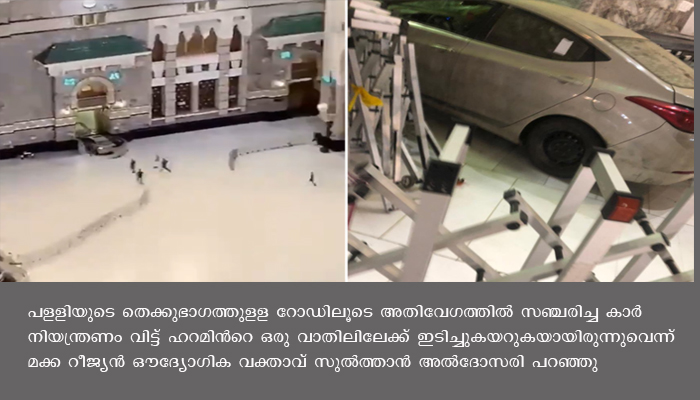30.10.2020 വെളളിയാഴ്ച രാത്രി 10.30 മണിയോടെയായിരുന്നുസംഭവം. പളളിയുടെ തെക്കുഭാഗത്തുളള റോഡിലൂടെ അതിവേഗത്തില് സഞ്ചരിച്ച കാര് നിയന്ത്രണം വിട്ട് ഹറമിന്റെ ഒരു വാതിലിലലേക്ക് ഇടിച്ചുകയറുകയായിരുന്നുവെന്ന് മക്ക റീജ്യന് ഔദ്യോഗിക വക്താവ് സുല്ത്താന് അല്ദോസരി പറഞ്ഞു. വാതിലില് ഇടിക്കുന്നതിന് മുമ്പ് ഒരു ബാരിക്കേട് തകര്ത്താണ് കാര് മുന്നോട്ട കുതിച്ചത്.