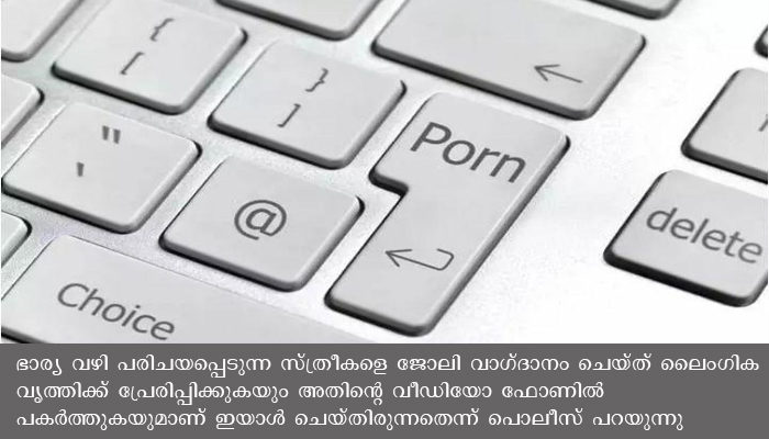 ഭാര്യ വഴി പരിചയപ്പെടുന്ന സ്ത്രീകളെ ജോലി വാഗ്ദാനം ചെയ്ത് ലൈംഗിക വൃത്തിക്ക് പ്രേരിപ്പിക്കുകയും അതിൻ്റെ വീഡിയോ ഫോണിൽ പകർത്തുകയുമാണ് ഇയാൾ ചെയ്തിരുന്നതെന്ന് പൊലീസ് പറയുന്നു. മുഖം വീഡിയോയിൽ പതിയുകയില്ലെന്ന് സ്ത്രീകളെ ഇയാൾ തെറ്റിദ്ധരിപ്പിച്ചിരുന്നതായും പൊലീസ് പറയുന്നു. എന്നാൽ വീഡിയോകളിൽ സ്ത്രീകളെ വ്യക്തമായി തിരിച്ചറിയാൻ സാധിച്ചിരുന്നു. ഈ വീഡിയോകൾ ഇയാൾ പോൺ സൈറ്റുകൾക്ക് വിൽക്കുകയായിരുന്നു.