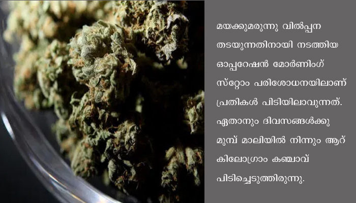വണ്ടന്മേട് പോലീസും ഇടുക്കി നര്ക്കോട്ടിക്ക് സെല്ലും ചേര്ന്നാണ് പ്രതികളെ അറസ്റ്റ് ചെയ്തത്. മയക്കുമരുന്നു വില്പ്പന തടയുന്നതിനായി നടത്തിയ ഓപ്പറേഷന് മോര്ണിംഗ് സ്റ്റോം പരിശോധനയിലാണ് പ്രതികള് പിടിയിലാവുന്നത്. ഏതാനും ദിവസങ്ങള്ക്കു മുമ്പ് മാലിയില് നിന്നും ആറ് കിലോഗ്രാം കഞ്ചാവ് പിടിച്ചെടുത്തിരുന്നു. വണ്ടന്മേട് സിഐ വിഎസ് നവാസിന്റെ നേതൃത്വത്തിലായിരുന്നു പരിശോധന.