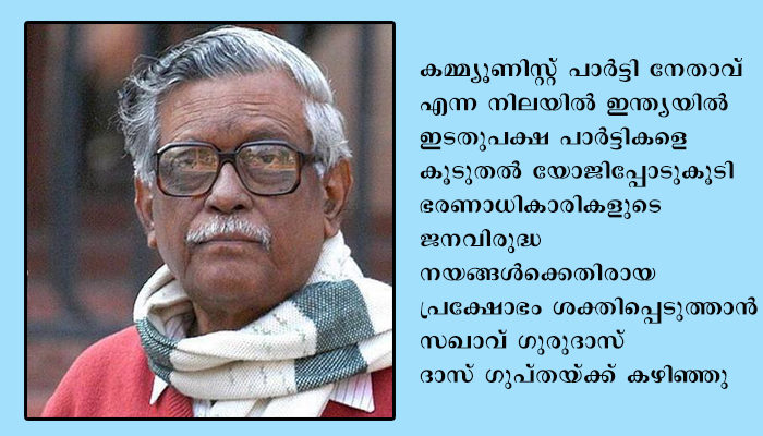 മികച്ച പാർലമെന്ററിയൻ എന്ന നിലയിൽ രാജ്യസഭയിലും ലോകസഭയിലും അംഗമായി ഇരുന്നു കൊണ്ട് സഖാവ് നടത്തിയ പ്രവർത്തനങ്ങൾ പാർലമെന്ററി ജനാധിപത്യത്തിന് വലിയ മുതൽകൂട്ടാണ്. കമ്മ്യൂണിസ്റ്റ് പാർട്ടി നേതാവ് എന്ന നിലയിൽ ഇന്ത്യയിൽ ഇടതുപക്ഷ പാർട്ടികളെ കൂടുതൽ യോജിപ്പോടുകൂടി ഭരണാധികാരികളുടെ ജനവിരുദ്ധ നയങ്ങൾക്കെതിരായ പ്രക്ഷോഭം ശക്തിപ്പെടുത്താൻ സഖാവ് ഗുരുദാസ് ദാസ് ഗുപ്തയ്ക്ക് കഴിഞ്ഞു എന്നത് വലിയ നേട്ടമാണ്.