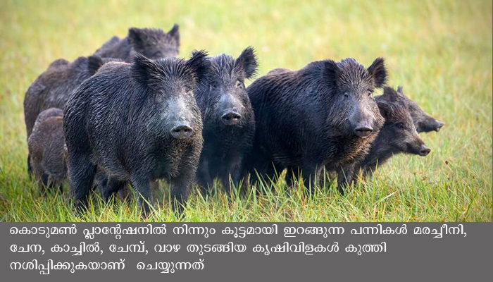 കൊടുമണ് പ്ലാന്റേഷനില് നിന്നും കൂട്ടമായി ഇറങ്ങുന്ന പന്നികള് മരച്ചീനി ചേന, കാച്ചില്, ചേമ്പ്, വാഴ തുടങ്ങിയ കൃഷിവിളകള് കുത്തി നശിപ്പിക്കുകയാണ് ചെയ്യുന്നത്. സര്ക്കാരില് നിന്ന് യാതൊരു സഹായവും ലഭിക്കാതെ കര്ഷകര് വലയുകയാണ്.