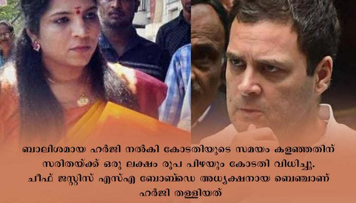 സരിതയുടെ അഭിഭാഷകര് തുടര്ച്ചയായി ഹാജര് ആകാത്തതിനെ തുടര്ന്നാണ് ഹര്ജി തള്ളുന്നതെന്ന് ചീഫ് ജസ്റ്റിസ് ബോബ്ഡെ വ്യക്തമാക്കി. ഇന്നും കേസ് പരിഗണിച്ചപ്പോള് സരിതയുടെ അഭിഭാഷകന് കോടതിയില് ഹാജരായിരുന്നില്ല. ഇതേ തുടര്ന്നാണ് പിഴയോടെ കോടതി ഹര്ജി തള്ളിയത്.