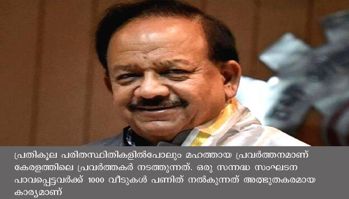 പ്രതികൂല പരിതസ്ഥിതികളില്പോലും മഹത്തായ പ്രവര്ത്തനമാണ് കേരളത്തിലെ പ്രവര്ത്തകര് നടത്തുന്നത്. ഒരു സന്നദ്ധ സംഘടന പാവപ്പെട്ടവര്ക്ക് 1000 വീടുകള് പണിത് നല്കുന്നത് അത്ഭുതകരമായ കാര്യമാണ്. കൊറോണ പ്രതിസന്ധി മറികടക്കാന് പ്രതിഫലേച്ഛകൂടാതെ സന്നദ്ധ പ്രവര്ത്തനം നത്തുന്ന പ്രവര്ത്തകര് രാജ്യത്തിന് തുണയാണെന്നും മന്ത്രി പറഞ്ഞു.