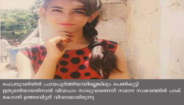 ഫെബ്രുവരിയില്‍ പ്രായപൂര്‍ത്തിയായില്ലെങ്കിലും പെണ്‍കുട്ടി ഋതുമതിയായതിനാല്‍ വിവാഹം സാധുവാണെന്ന് സമാന സംഭവത്തില്‍ പാക് കോടതി ഉത്തരവിട്ടത് വിവാദമായിരുന്നു. 2014 ല്‍ പുറത്തിറങ്ങിയ സിന്ധ് പ്രവശ്യയിലെ ശൈശവ വിവാഹ നിരോധന നിയമപ്രകാരം 18 വയസാണ് ഇവിടെ വിവാഹ പ്രായമെന്ന് പെണ്‍കുട്ടിയുടെ രക്ഷകര്‍ത്താക്കള്‍ അന്ന് കോടതിയില്‍ വാദിച്ചെങ്കിലും കോടതി ശരീഅത്ത് പ്രകാരം 14 വയസുള്ള പെണ്‍കുട്ടിയുടെ വിവാഹം സാധൂകരിച്ചത് പാക്കിസ്ഥാനിലെ മതന്യൂന പക്ഷങ്ങളെ ആശങ്കയിലാക്കിയിരുന്നു.