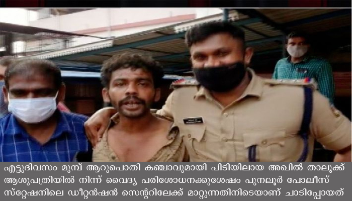കൊല്ലം: പോലീസ് കസ്റ്റഡിയില് ഇരിക്കെ അതിവിദഗ്ധമായി വിലങ്ങ് അഴിച്ചുമാറ്റി രക്ഷപെട്ട പ്രതി വീണ്ടും കസ്റ്റഡിയിലായി. പുന്നല സ്വദേശി അഖില് 8 ദിവസങ്ങള്ക്ക് ശേഷമാണ് വീണ്ടും പിടിയിലാവുന്നത്. എട്ടുദിവസം മുമ്പ് ആറുപൊതി കഞ്ചാവുമായി പിടിയിലായ അഖില് താലൂക്ക് ആശുപത്രിയില് നിന്ന് വൈദ്യ പരിശോധനക്കുശേഷം പുനലൂര് പോലീസ് സ്റ്റേഷനിലെ ഡീറ്റന്ഷന് സെന്ററിലേക്ക് മാറ്റുന്നതിനിടെയാണ് ചാടിപ്പോയത്.