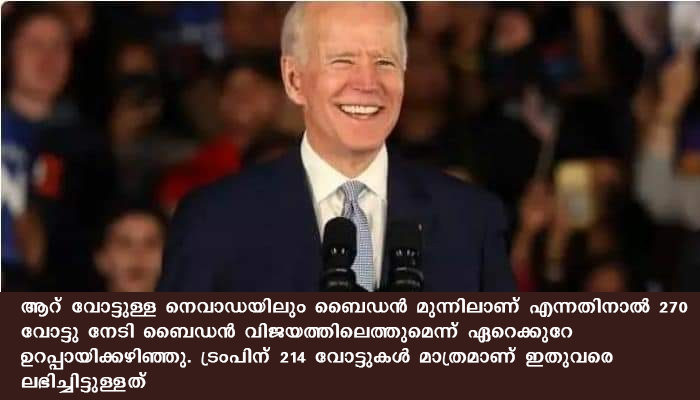 വാഷിംഗ്ടൺ : അമേരിക്കൻ തെരഞ്ഞെടുപ്പിൽ ജോ ബൈഡൻ വിജയത്തിനരികിൽ. 264 ഇലക്ടറൽ കോളജ് വോട്ടുകൾ ബൈഡൻ ഉറപ്പിച്ചു. ആറ് വോട്ടുള്ള നെവാഡയിലും ബൈഡൻ മുന്നിലാണ് എന്നതിനാൽ 270 വോട്ടു നേടി ബൈഡൻ വിജയത്തിലെത്തുമെന്ന് ഏറെക്കുറേ ഉറപ്പായിക്കഴിഞ്ഞു. ട്രംപിന് 214 വോട്ടുകൾ മാത്രമാണ് ഇതുവരെ ലഭിച്ചിട്ടുള്ളത്. ജയം ഉറപ്പെന്ന് ബൈഡൻ ട്വീറ്റ് ചെയ്തിട്ടുണ്ട്.