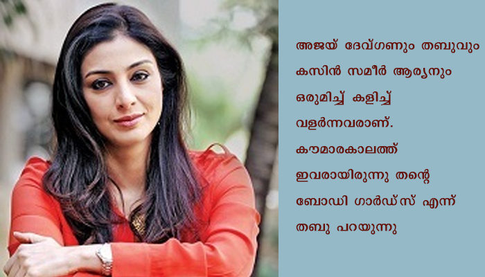 മുന്പ് ഒരു അഭിമുഖത്തില് തബു പറഞ്ഞിരുന്നു. അജയ് ദേവ്ഗണും തബുവും കസിന് സമീര് ആര്യനും ഒരുമിച്ച് കളിച്ച് വളര്ന്നവരാണ്. കൗമാരകാലത്ത് ഇവരായിരുന്നു തന്റെ ബോഡി ഗാര്ഡ്സ് എന്ന് തബു പറയുന്നു. ”അന്നൊക്കെ ഞാനെവിടെയെങ്കിലും പോയാല് പിന്നാലെ ഞാനറിയാതെ വരും. ഏതെങ്കിലും ചെറുപ്പക്കാരന് എന്നെ ശല്യം ചെയ്യുകയോ, എന്റെ പിന്നാലെ നടക്കുകയോ ചെയ്താല് അവനെ വളഞ്ഞിട്ട് തല്ലി ഭീഷണിപ്പെടുത്തും. അതൊക്കെ കൊണ്ടാണ് ഞാന് വിവാഹം ചെയ്യാതെ പോയത്” എന്നാണ് തബു പറഞ്ഞത്. താന് എന്താണ് ചെയ്തത് എന്നതിനെ കുറിച്ച് ഇപ്പോള് അജയ് ദേവ്ഗണിന് വേണമെങ്കില് ഒന്നും പശ്ചാതാപിയ്ക്കാം എന്നും തമാശയായി തബു പറഞ്ഞു.